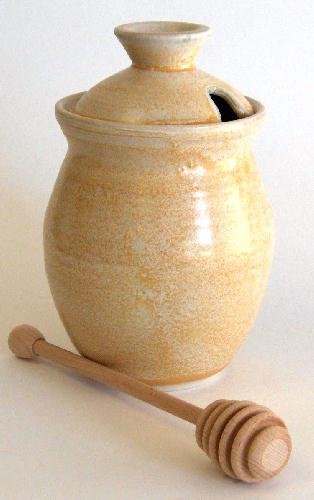 Hand-thrown stoneware honey pot by New Mexico potter R.L. Rising of Las Cruces. The colour shown is called Golden Desert. Approximately 6 inches tall. All sizes are approximate because each one is handthrown and vary accordingly. Included in the price is a wooden honey dipper of very good quality. Fired to 2400F., footed, and signed 'Rising, Las Cruces' on the bottom. Readmore .. .